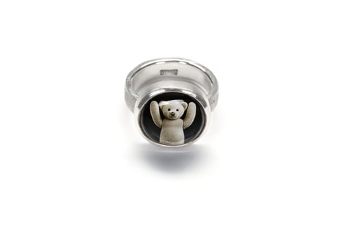 Teddy-bear’s silver ring with photo, rock crystal and Latin inscription.