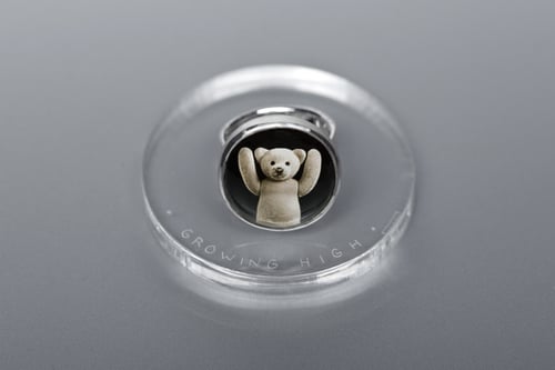 " Growing high" Teddy-bear’s silver ring with photo, rock crystal · IN EXCELSITATEM NASCI ·