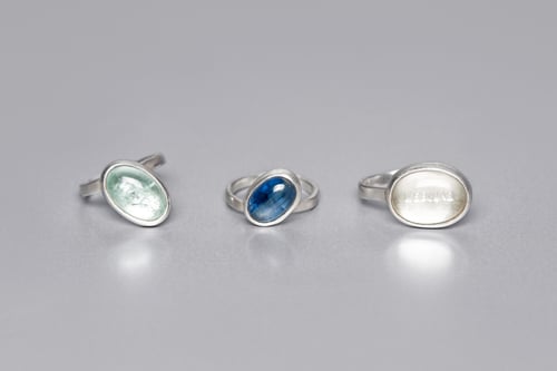 Sterling silver rings with aquamarine, rock crystal and kyanite. Inscription in Latin under the stone and around the ring.