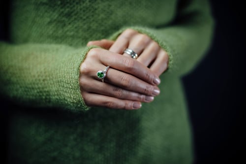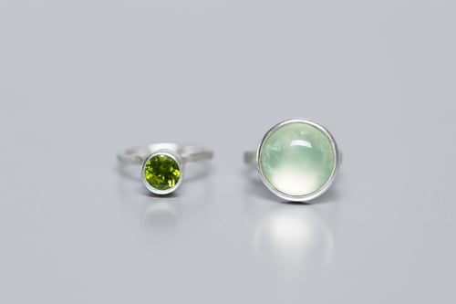 "To aim high" silver rings with prehnite and chrysolite · SPIRARE MAJORA ·
